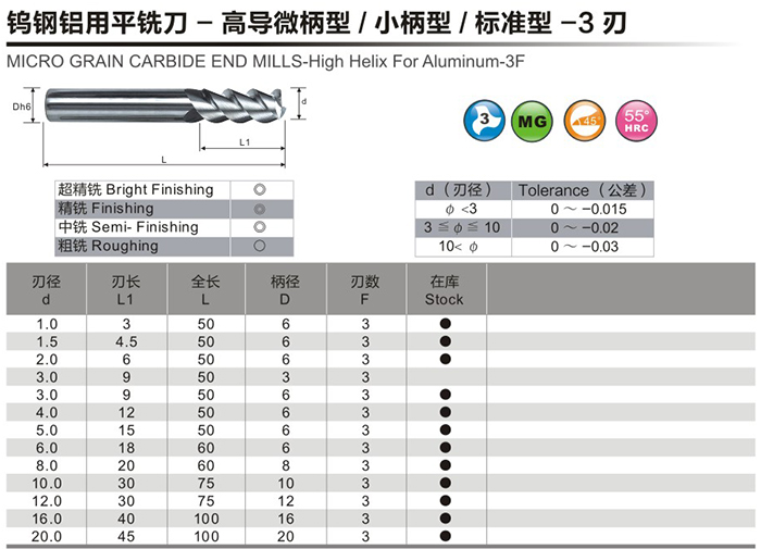 鎢鋼鋁用平銑刀-高導微型柄/小柄型/標準型-3刃