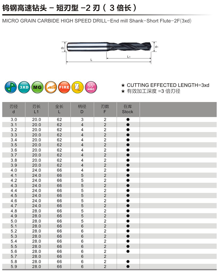 鎢鋼高速鉆頭-短刃型-2刃(3倍長)